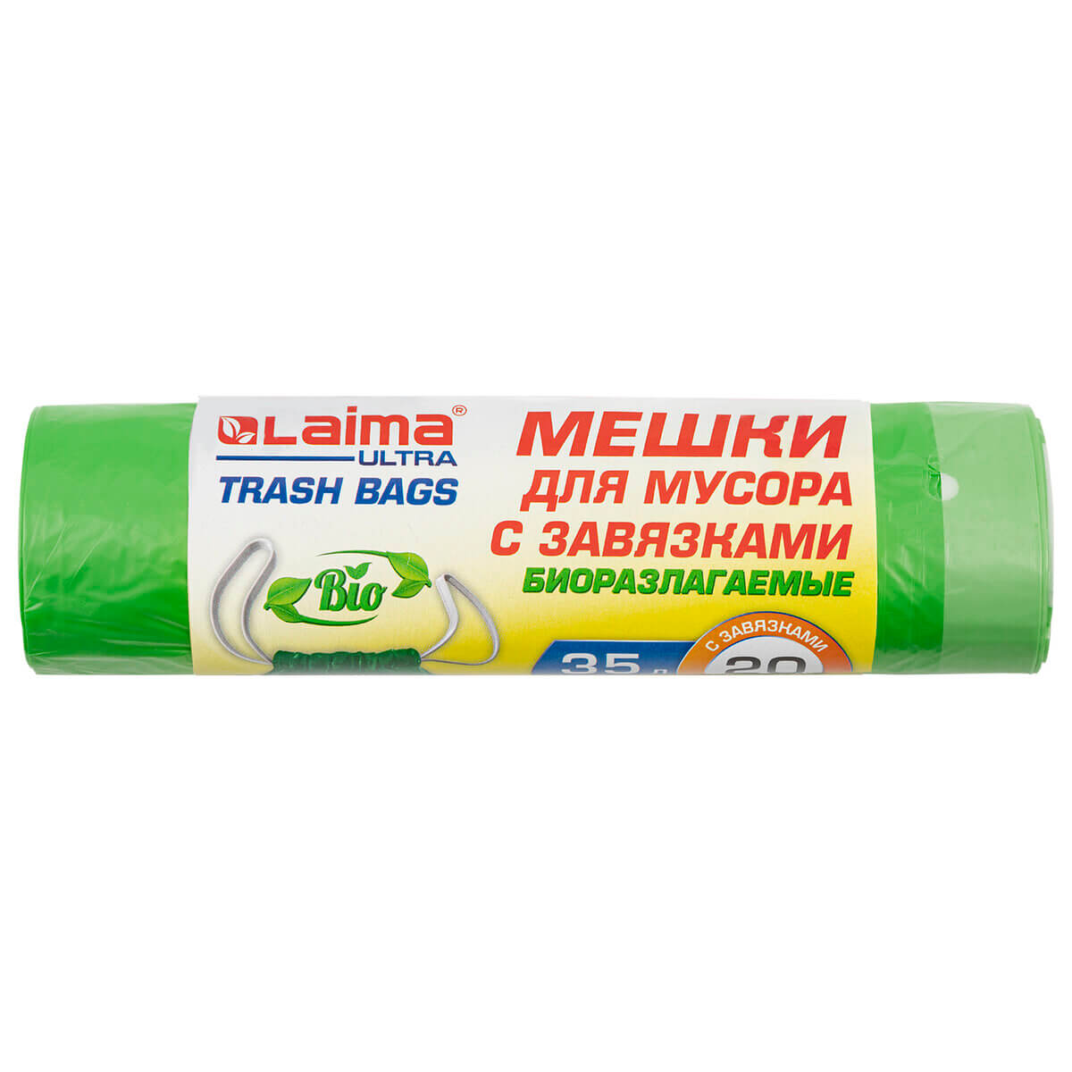 Мешки для мусора 35 л, биоразлагаемые с завязками, зеленые, в рулоне 20 шт., ПНД, 14 мкм, 600х500 мм, LAIMA ULTRA, 607688