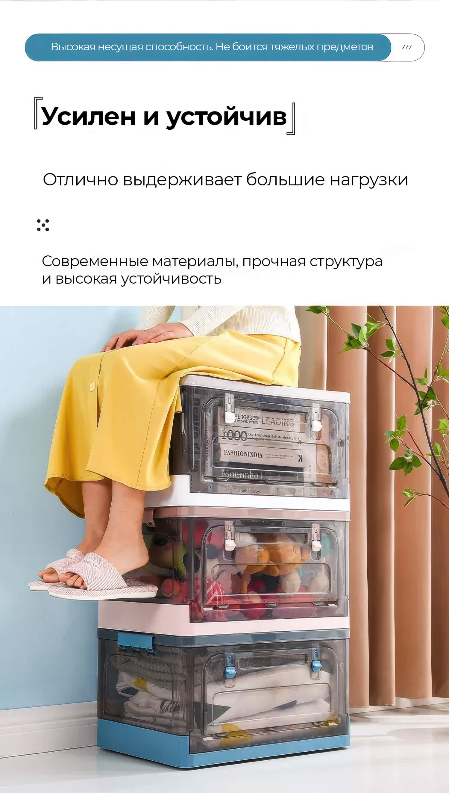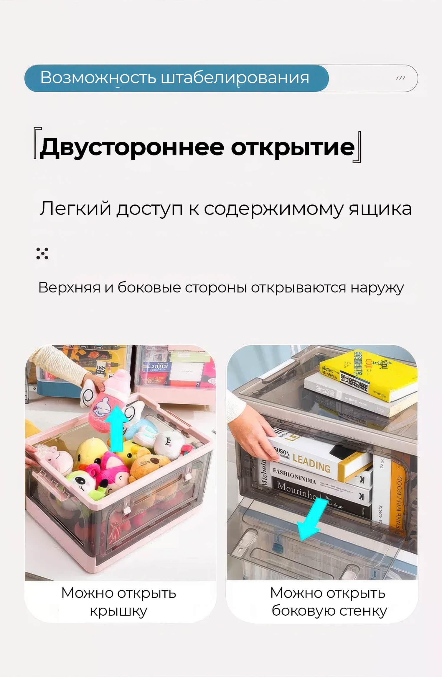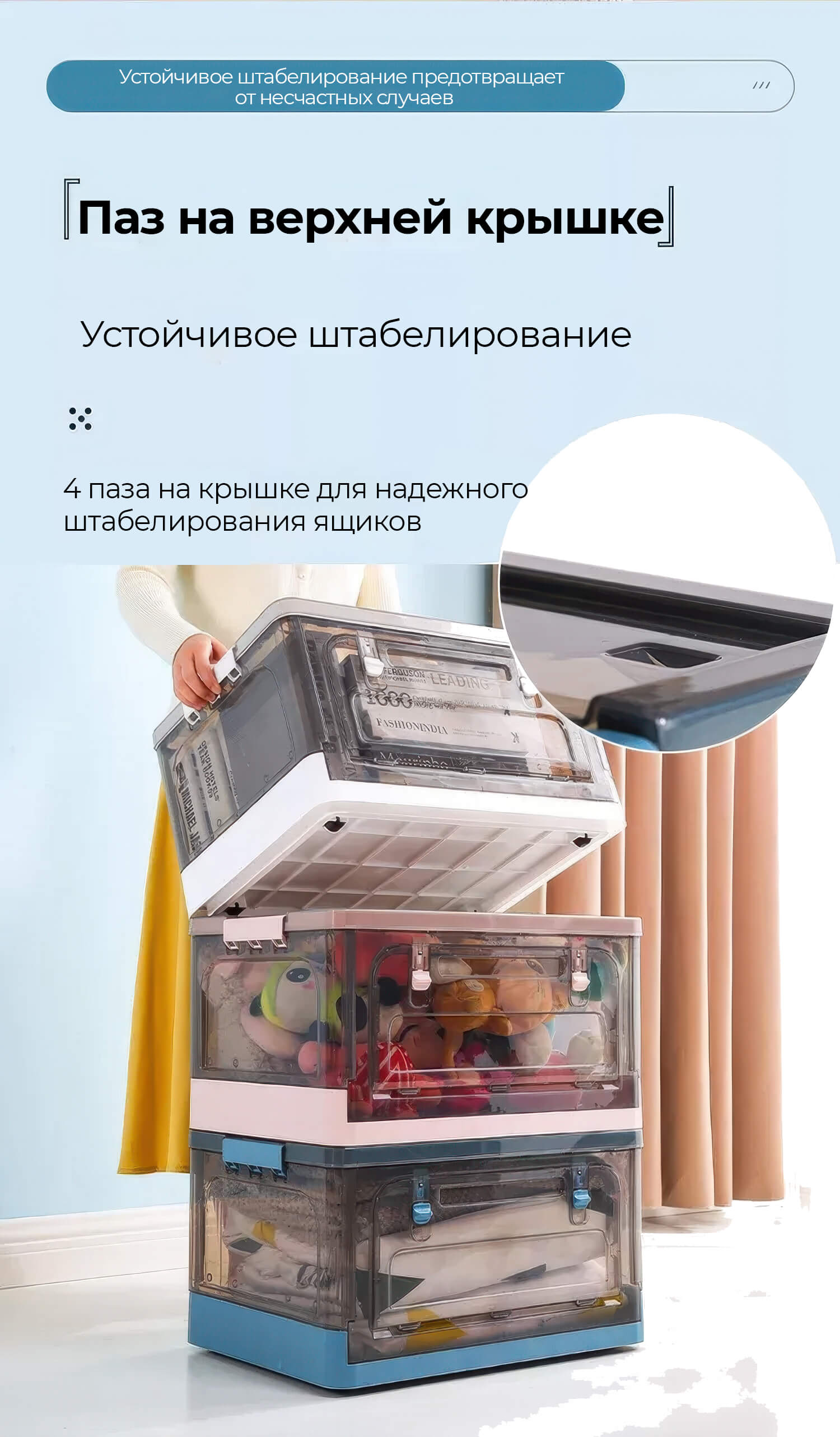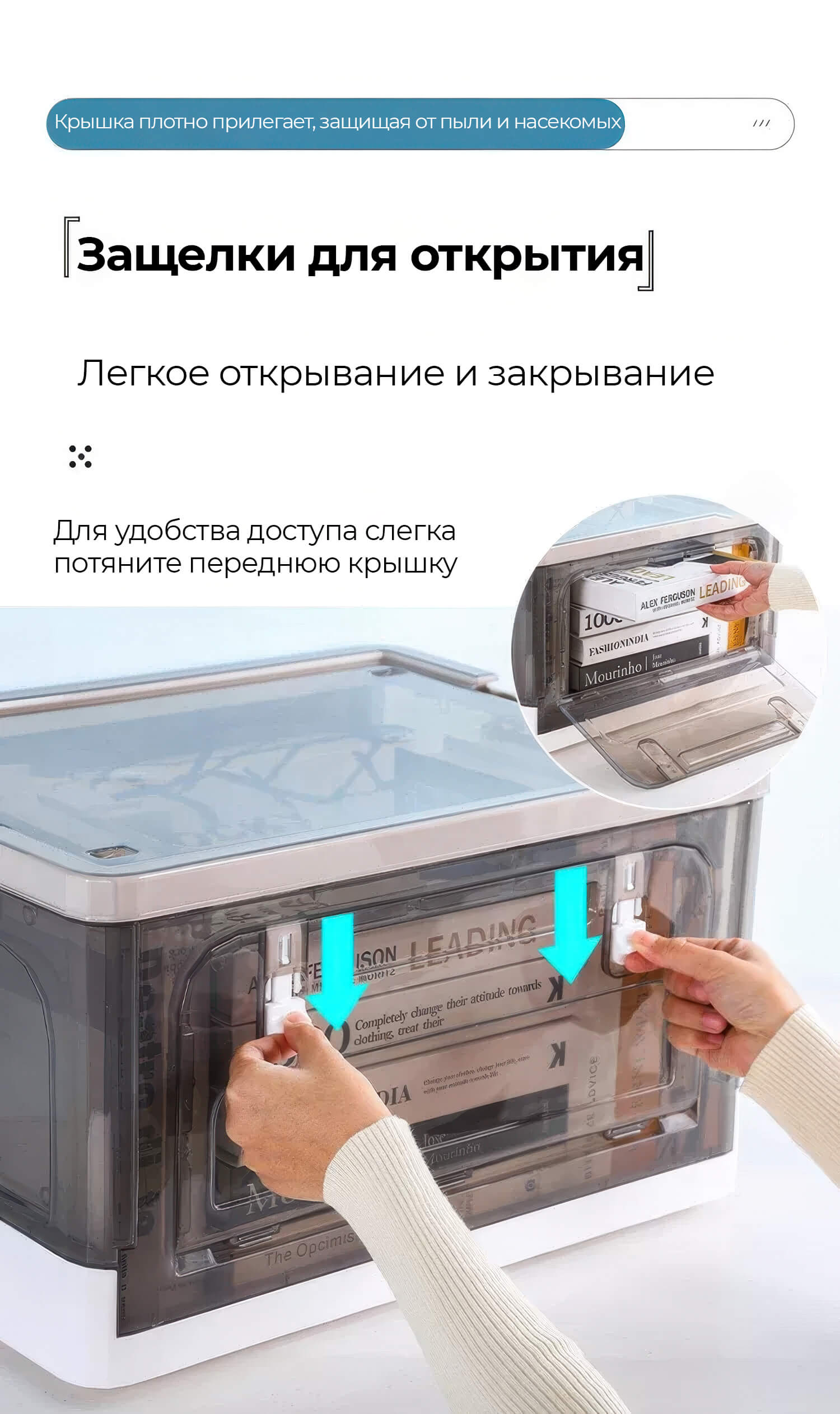 Пластиковая коробка с крышкой защищает вещи от пыли и влаги, обеспечивая чистоту и порядок. Прочная конструкция гарантирует долговечность, а складной механизм позволяет экономить место, когда контейнер не используется.