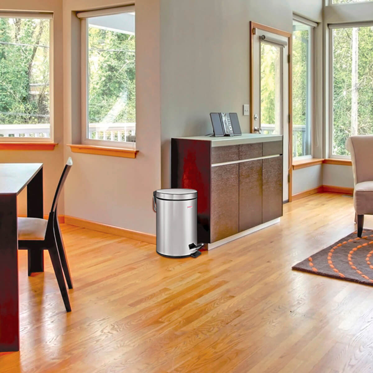 Внутреннее съемное ведро из прочного пластика снабжено удобной рукояткой для комфортного извлечения мусора. Изготовленное из нержавеющей стали с антикоррозийным покрытием, оно гарантирует долгий срок службы. Прочная конструкция с антискользящим основанием обеспечивает надежность в использовании.